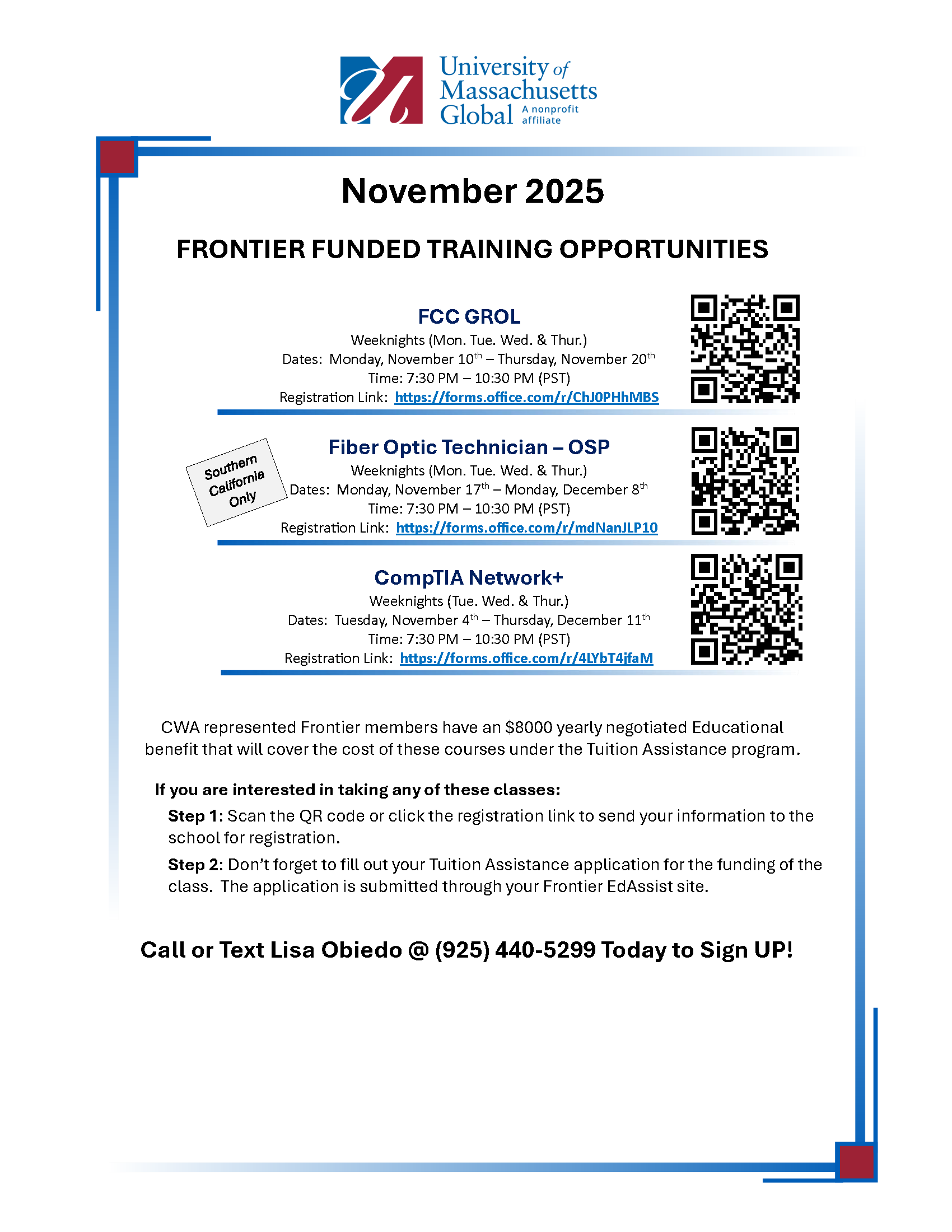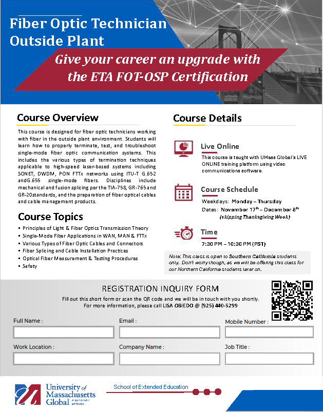 In November, UMass is offering 4 classes to our members. See below for the list of links to the individual classes (please note that the Fiber Optic class is only being offered in SoCal this time).
