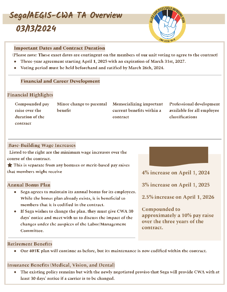 **Sega of America workers have overwhelmingly approved the Tentative Agreement**